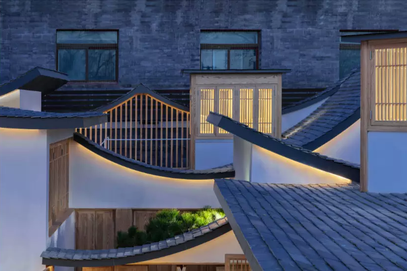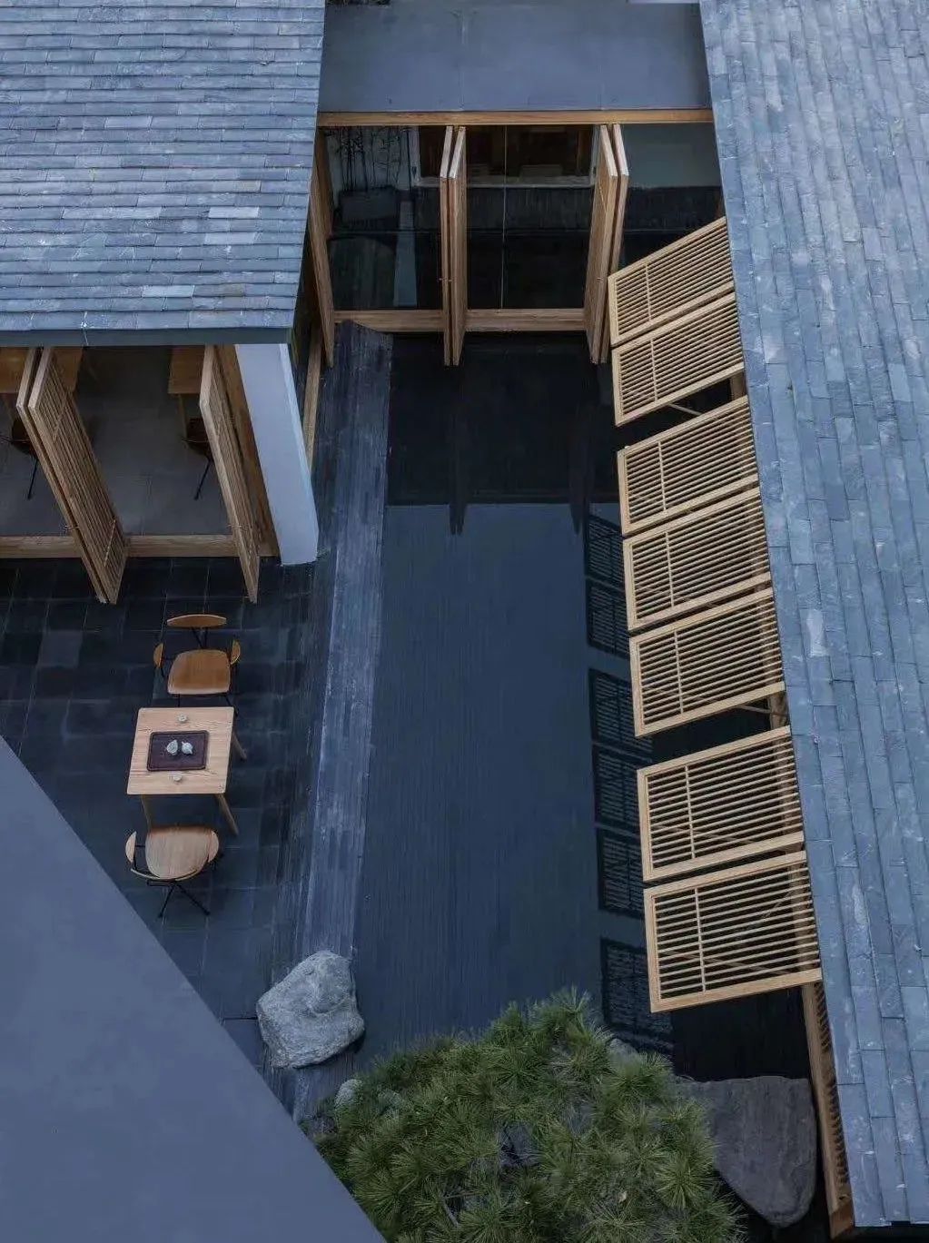 这是最大胆、最标新立异的茶空间。整个设计以“层林叠浪,长亭卧波”为主题,浪是院子的房檐,长亭是一个个精巧的茶室。
