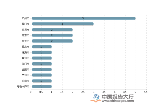 中国茶叶上市公司注册地址数量占比报告大厅对2019年中国茶叶上市公司利润规模排行榜(全年度)数据统计显示,前22家利润总额企业中,注册地址在广州市的企业数量最多,共有5家企业上榜,占据了榜单总数的22.73%;注册地址在厦门市的企业数量排在第二,共有3家企业上榜,其次是深圳市、南京市等地区,分别有2家、2家。上榜数量最少的地区为乌鲁木齐市,仅有1家企业入选。