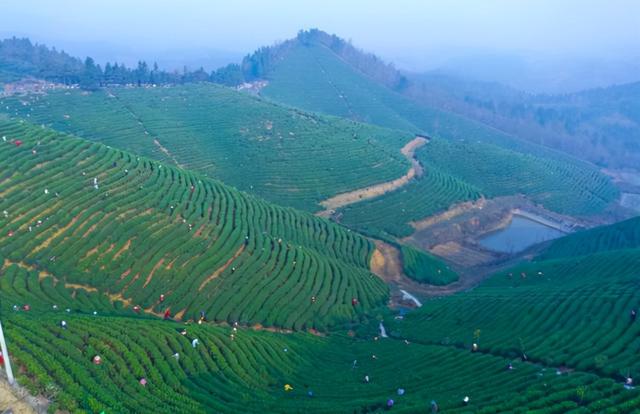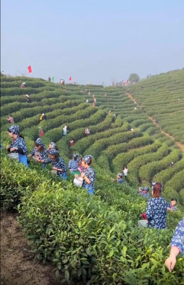 近日,信阳光山县白雀园镇大尖山茶叶种植基地一片繁忙景象。天气晴朗,春风吹佛,茶山上约500名采茶工正飞速翻动手指,采摘芽叶。自3月13日以来,该基地率先开采,车水马龙,热闹非凡。