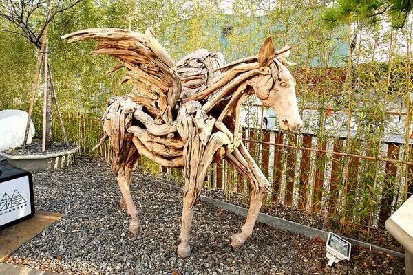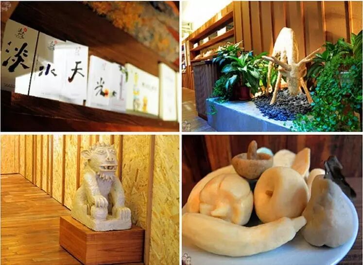 淡水天光空间建材贯彻环保里面,地板为废弃回收木材重新抛光切割而成;店门口的肥皂石狮子,仿效台湾庙宇门口避邪镇煞之用,还有以肥皂制成的水果(这个真的不能吃!)。
