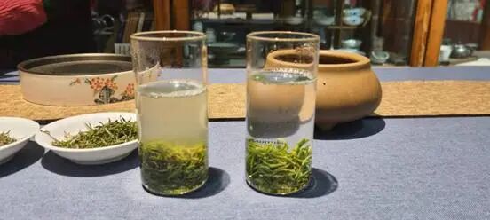 汤色:茶汤呈黄绿色,清澈透亮,有白毫漂浮,喝上一口,茶香充满口腔,咽下之后,回甘生津明显