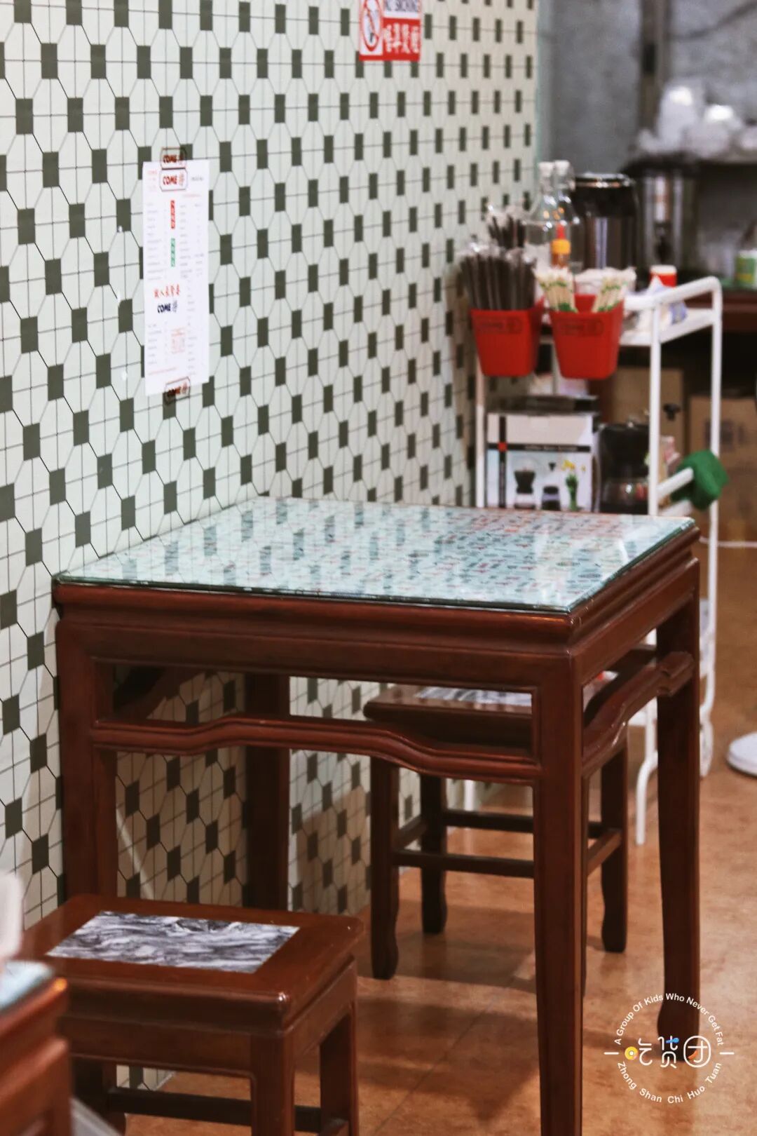 一进店就感觉自己穿越到90年代,特别是一道阳光打在墙壁上,有一种时空穿越的感觉,两面墙壁铺满了小时候常见的绿格子砖。