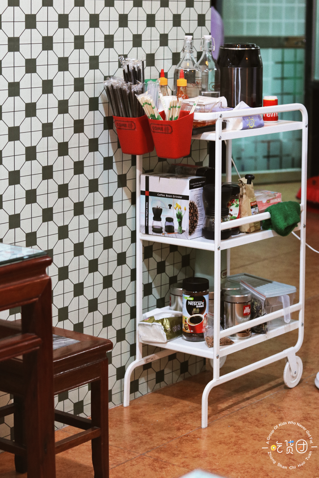 离座位不远处还有一个小推车摆满了调料品及用餐工具,方便店员在忙时,客人可以自助拿取所需品,这些细节还是蛮加分的。