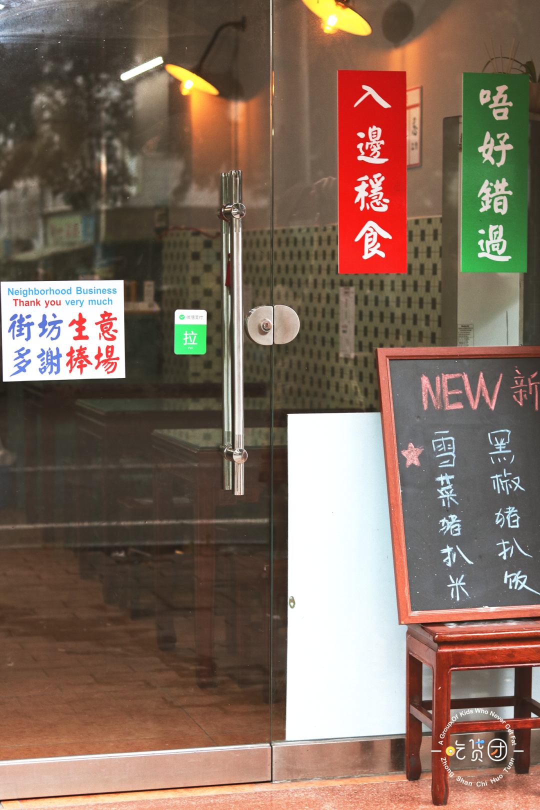 让我觉得特别可爱的是,店家特意在大门上贴了“街坊生意,多谢捧场”的小牌子,从这个“事先声明”看来,老板也是很怕成为所谓的“网红店”,想要踏踏实实从身边做起呢。