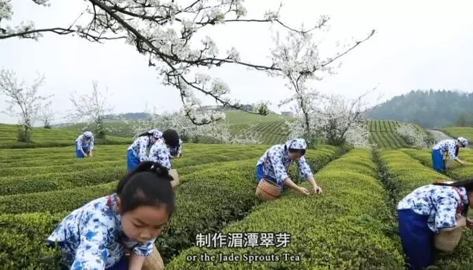 正是三月,当年出产贡茶的云贵山上,第一茬春芽已经冒出,茶园里的采茶姑娘, 挎一个小背篓,轻快的双手在芽尖上跳跃。不同的叶子制做不同的茶,这次明前茶是要采来细嫩的独芽,制作湄潭翠芽。