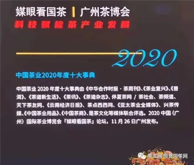 中国茶业2020年度十大事典在2020中国(广州)国际茶业博览会【媒眼看国茶】论坛上隆重发布。由《中华合作时报·茶周刊》,《茗边》(茶讯),茶频道等多家茶媒体联合评选。于11月26日在广州发布。十大事典如下: