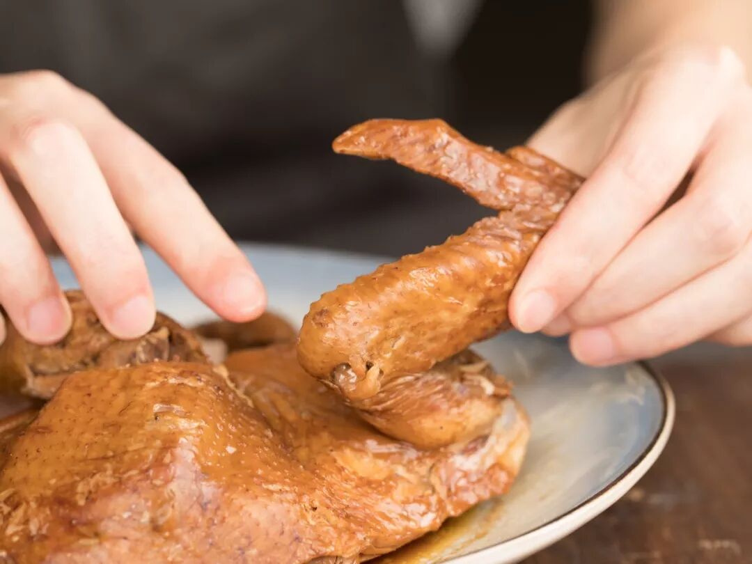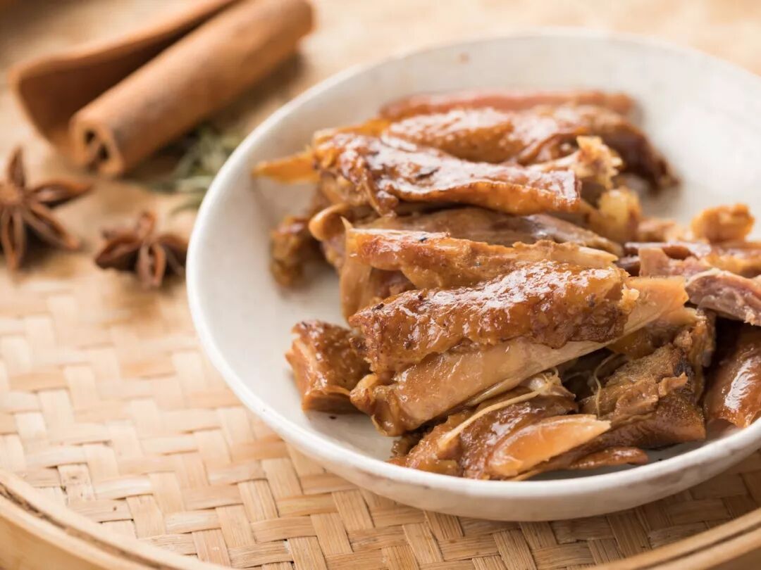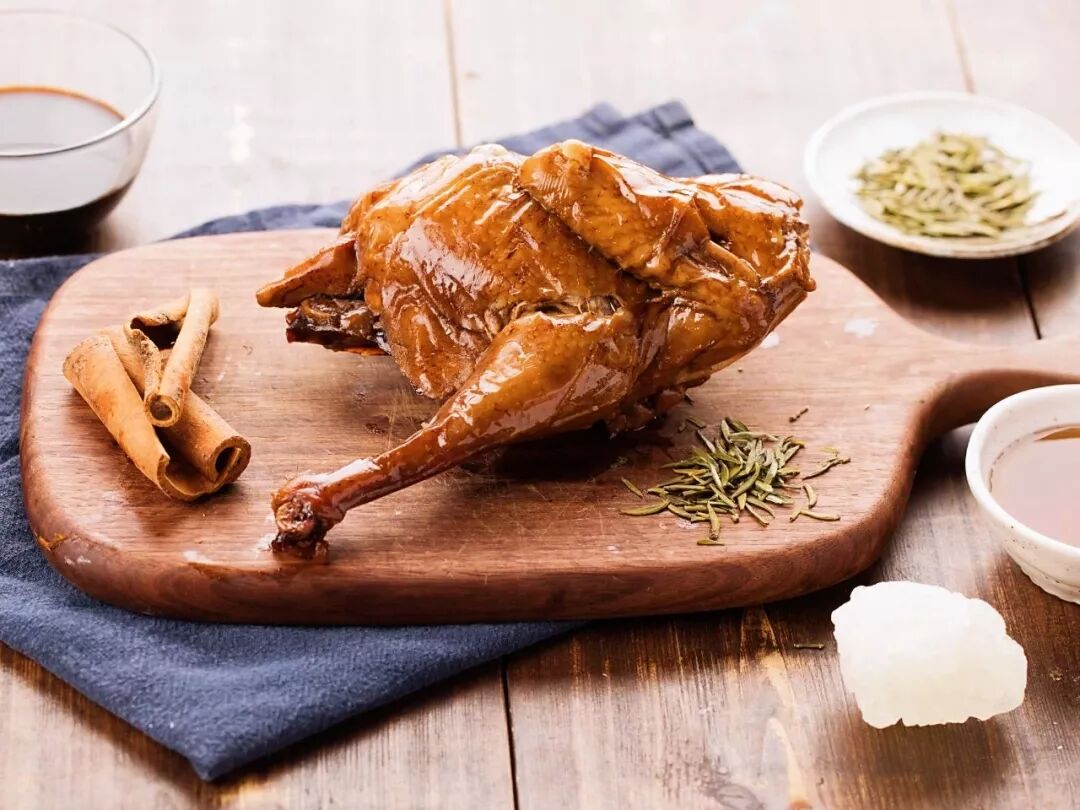 茶香鸡,先腌后卤,再用茶叶、大米、红糖熏制入味。