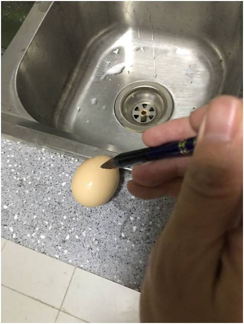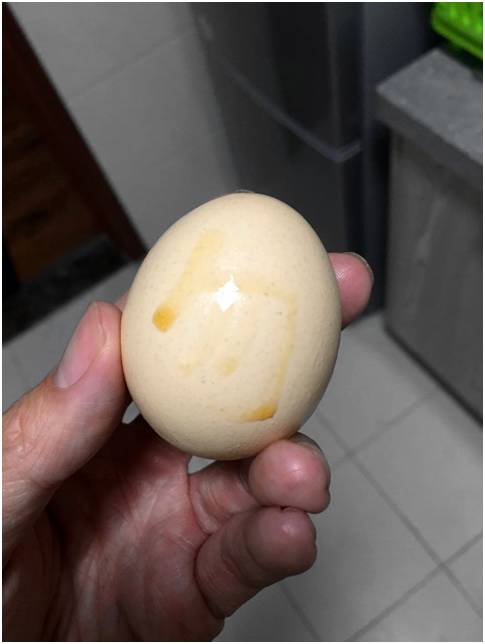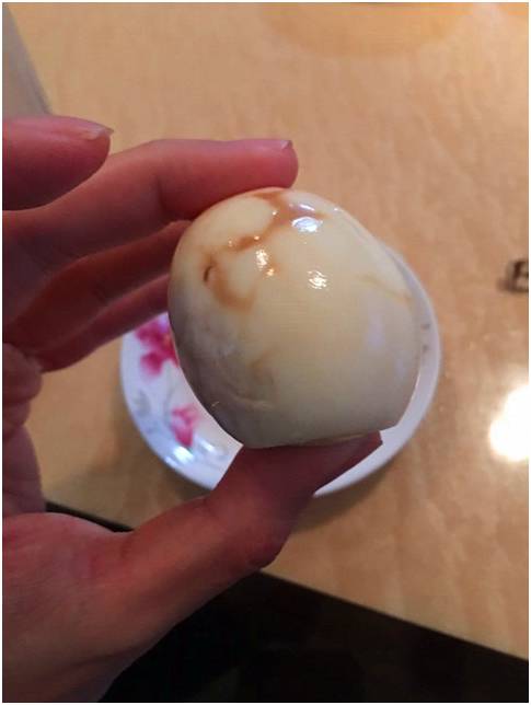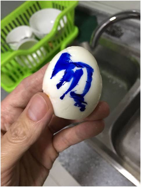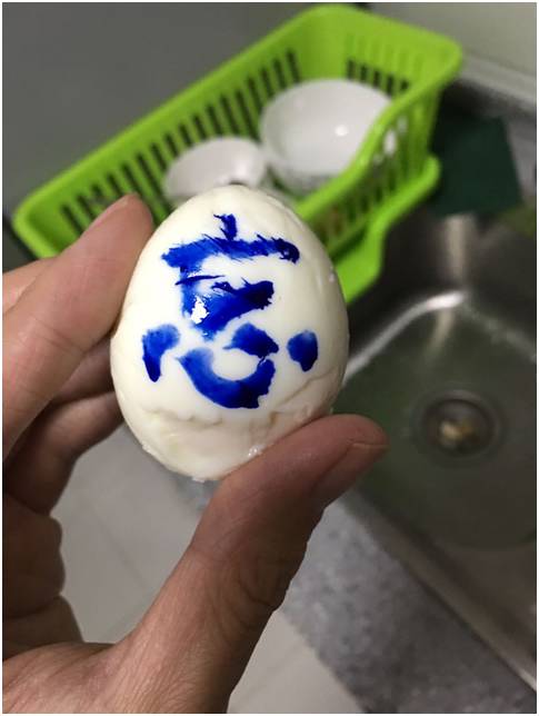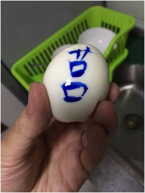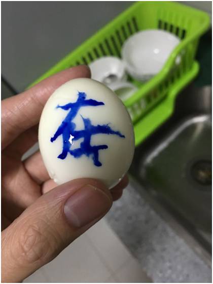 3.待白醋风干后,把蛋放进锅里煮熟,剥去蛋壳就能看见蛋白上的紫蓝色密文“勿忘在莒”,当然你要写“乐不思蜀”也无妨,这取决于你想做哪一个版本的老陈了。