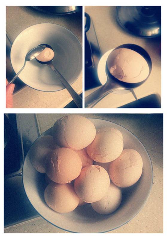 5.煮好后,用勺子细细将蛋壳敲破,方便腌制时入味。记得别太用力,免得把蛋敲碎了,怎么掌握力度呢?想象一下那是你身上的蛋。