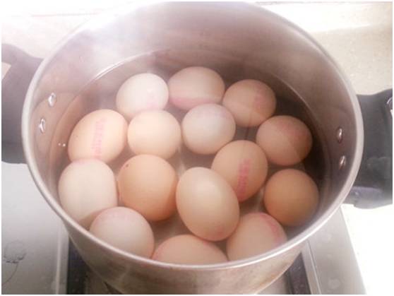 4.另一路蛋用来做茶叶蛋。首先把生鸡蛋用白水煮熟。白水煮蛋看似人人都会,但实则学问不小。诀窍是一是用小火,二是不关锅盖,三是在锅里放盐,这样能全方位防止鸡蛋被煮破、蛋白喷出。