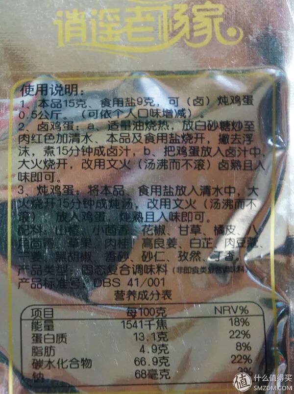 比如楼主买的这种茶鸡蛋料,是多种香料搭配好的,背面有说明,本品15克加9克盐,适合卤鸡蛋一斤。并且下面讲了基本做法,不过这个做法很一般,有些步骤多余而有些必要的步骤没有,不知所云,最好不要照做,你们看我的食谱流程就行了,基本是最好的了。