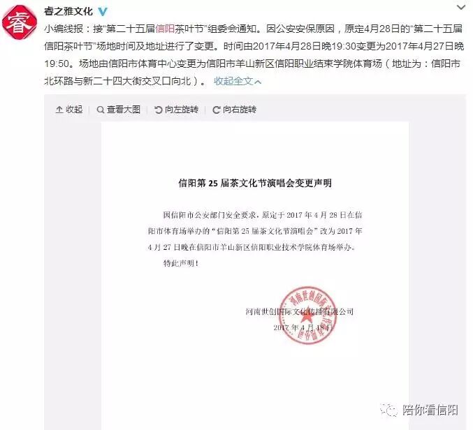 4月20日笔者看到一条微博,小编线报:接“第二十五届信阳茶叶节”组委会通知。因公安安保原因,原定4月28日的“第二十五届信阳茶叶节”场地时间及地址进行了变更。时间由2017年4月28日晚19:30变更为2017年4月27日晚19:50。场地由信阳市体育中心变更为信阳市羊山新区信阳职业结束学院体育场(地址为:信阳市北环路与新二十四大街交叉口向北)。
