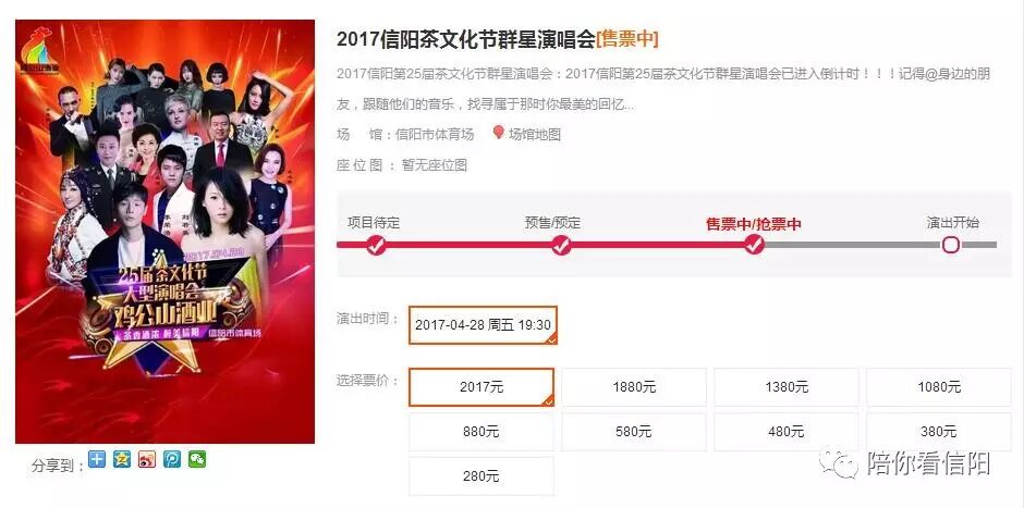 一张门票贵的2017元,最便宜的280元.......钱都被“黑心商人”利用“茶文化节”的幌子把钱赚走了,演唱会过后,明星们拿着出场费,商人们拿着门票钱都走了,他们赚的是信阳市人民的血汗钱,却拿到外地花费......对信阳的GDP经济发展贡献不大。