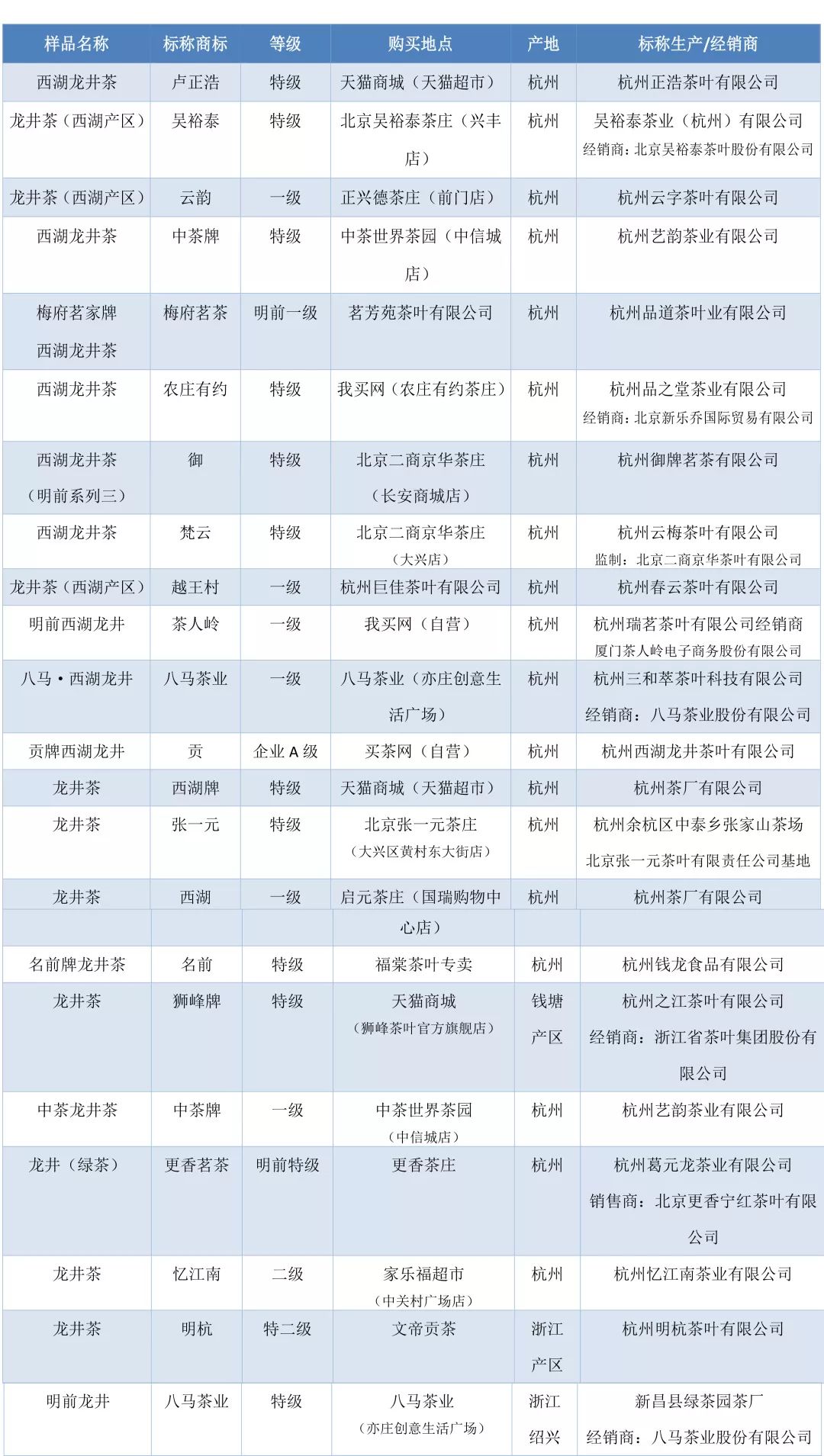10月28日,北京市消协向社会发布了龙井茶比较试验结果。本次比较试验样品由北京市消费者协会的工作人员以消费者的身份在北京的超市、茶庄、茶城、茶专柜及天猫商城、我买网、买茶网和苏宁易购等网购渠道随机购买,所有样品均为预包装产品。共涉及45个样品,其中21个样品标称西湖龙井茶,24个样品标称龙井茶。购买价格折合每500克从126.7元到5366.7元不等。