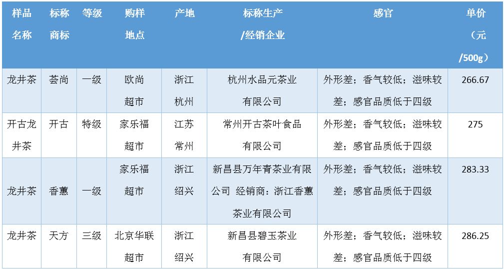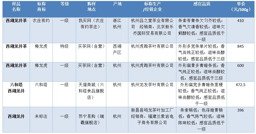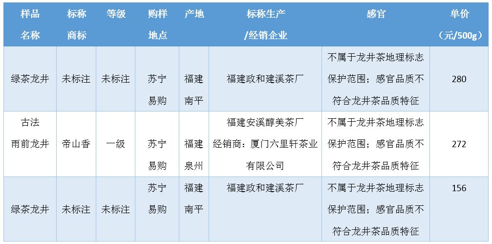 除了标称为西湖龙井茶的样品外,还有24个样品标称为龙井茶。经测试,11个样品感官品质明示与实测不符,其中有3个龙井茶为假冒龙井茶。