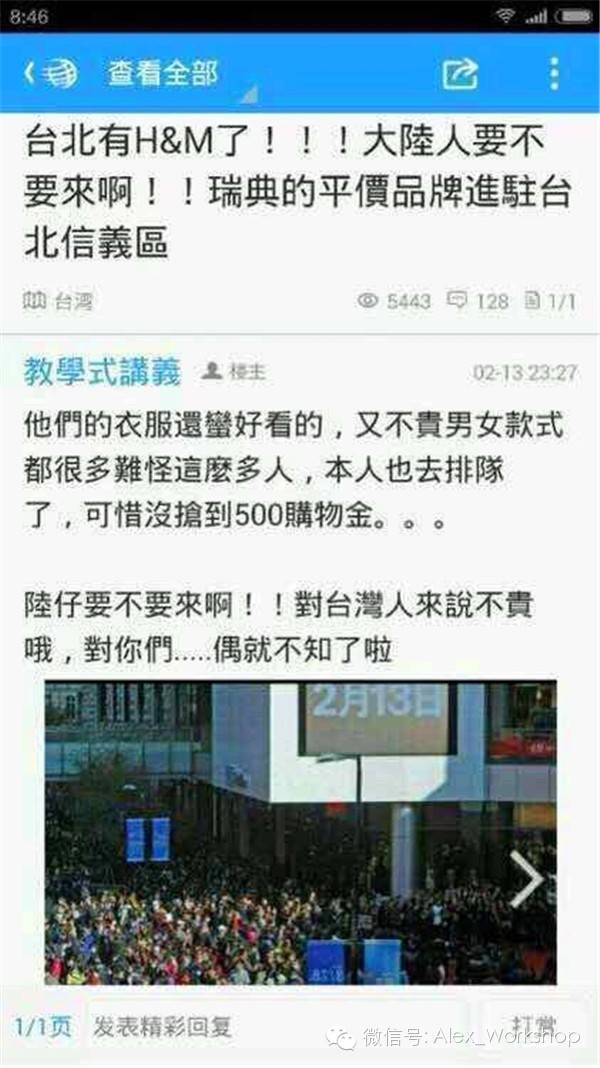 2月13日晚间11点27分左右,一位名叫 @教学式讲义 的网友就在天涯论坛的台湾版块向众人展示自己的喜悦。他在题为《台北有H&M了!!!大陆人要不要来啊!!瑞典的平价品牌进驻台北信义区》的帖子下如是说道:“他们的衣服还蛮好看的,又不贵 男女款式都很多 难怪这麽多人,本人也去排队了,可惜没抢到500购物金……陆仔要不要来啊!!对台湾人来说不贵哦,对你们.....偶就不知了啦。”(观察者网注:此句意为他们的衣服还蛮好看的,又不贵,男女款式都很多,难怪这么多人,本人也去排队了,可惜没抢到500购物金……大陆人要不要啊!对台湾人来说不贵哦,对你们……我就不知道了。)言谈举止之间,一股浓浓的茶叶蛋香味扑鼻而来。