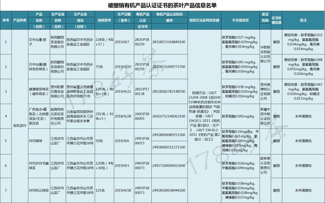 近日,国家市场监管总局发布了关于2019年有机茶叶产品(网售)认证有效性抽查结果,对7批次被检出有机产品国家标准禁用物质的网售有机茶产品,作出撤销有机产品认证证书的处理,且5年内不可再认证。