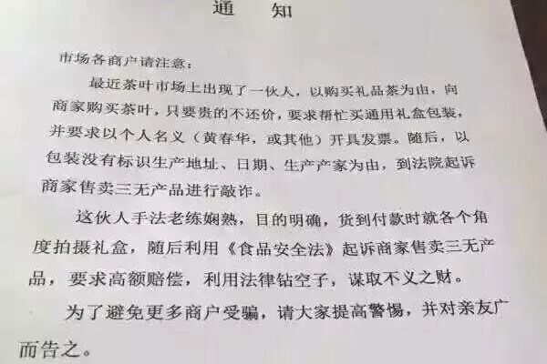 在广州芳村锦桂茶叶市场,卖大红袍的店主杨先生说,5月中旬,两名男子进入他的店铺,询问有无礼盒以及是否可以送货,当天他们并没有购买茶叶,只是带走了杨先生的名片和店里的茶叶样品。一星期后,杨先生接到了电话,电话那头的人自称张某,他说前几天来店里看过货,现在想买些茶叶。张某说茶叶是用来送礼的,不想用原装包装盒,他要求杨先生用店里礼盒对茶叶重新进行包装,而这种礼盒是没有写出厂日期的。当天,杨先生按照张某的要求把茶叶重新包装后发了快递。本以为这单生意就做成了,可没想到6月23日,杨先生却收到了法院的传票。起诉人张某以杨先生售卖的茶叶是“三无产品”,要求他退换货款4600元,并支付售价10倍的赔偿金46000元。