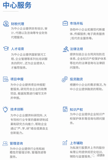 中心以文化赋能、资本助力为核心,为中小微企业创业者解决销售难、招商难、融资难等一系列问题,搭建价值库,包括产品项目、资源资金、互联网工具方法、提升能力能量等,打造中小微企业数字化智能化的科技创新服务平台。