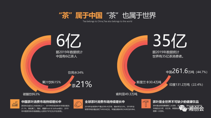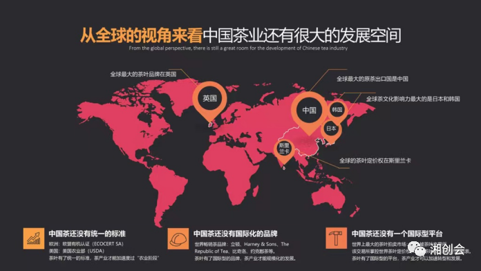 所以基于这种现状就意味着我们中国茶产业不管是在国内还是在全球做的都不好,但是中国有两大优势,一个是中国是全世界最大的产茶国,有消费市场,有茶叶。