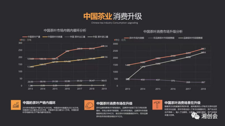再看中国茶叶的消费升级图,左边是中国茶叶市场的内销内循环的分析图,中国茶叶的产量从2013年到2019年的数据就是橙色的线,从2013年到15年还相对平稳,从2015年开始相对大幅度的上升,而黄色的线是中国茶叶的内销量,从2013年到2019年为整体的上升趋势,只是它产量的幅度跟它的销量的幅度明显小一些,通过这两根线的对比,意味着市场上存在产量是大于销量,存在着很多产能过剩的问题。