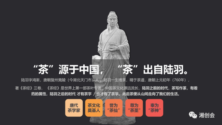 为什么他能够被称为茶圣?因为我们所知道的茶这个字就是他发明的,以前这个字不读“茶”,读“荼”,同时陆羽还撰写了世界上第一部茶叶专著——《茶经》,这是目前世界上保存最早,最完整的茶叶专著,因为有了这部《茶经》,才使得中国乃至全世界,真正意义上有了茶的文化。茶这种植物在四五千万年前它就有了,但是在过去它仅仅是一种植物的形式存在。