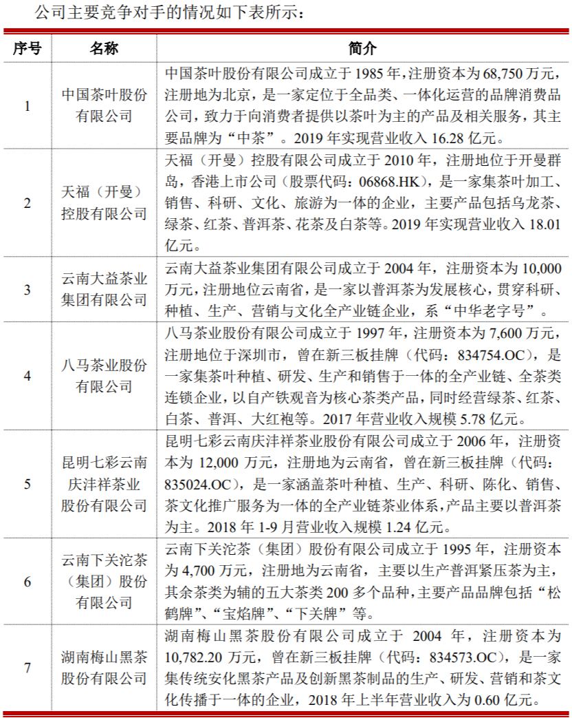 在招股书中,公司列举了7家竞争对手,除了天福(开曼)已在香港上市外,八马茶叶、七彩云南、梅山黑茶都曾在新三板挂牌。如果公司成功过会,将成为A股第一家茶叶上市公司。