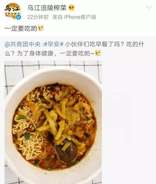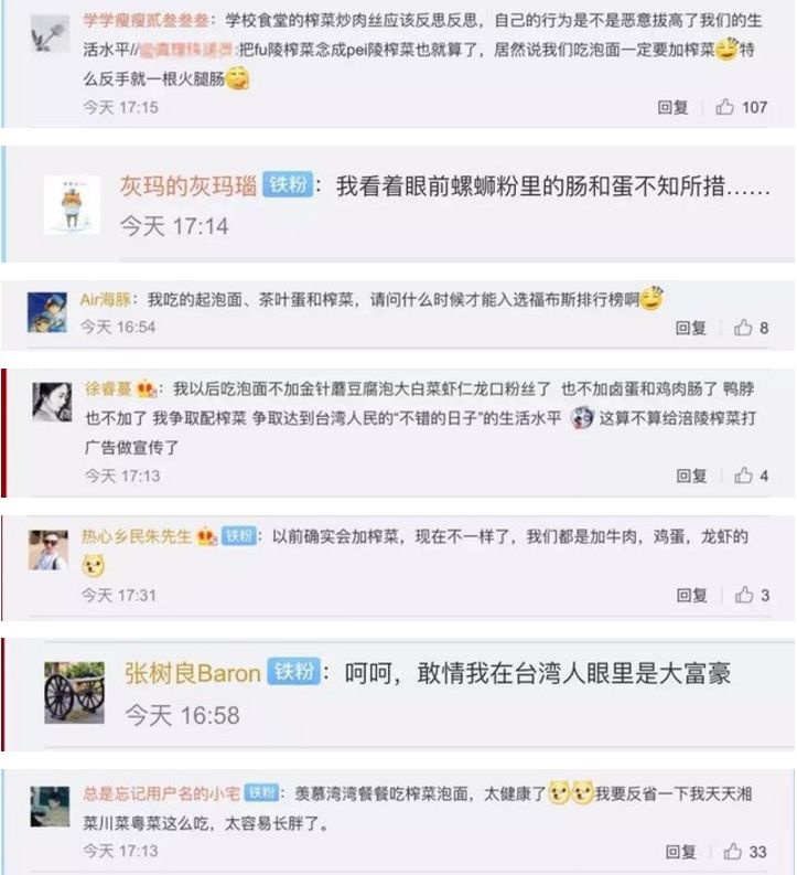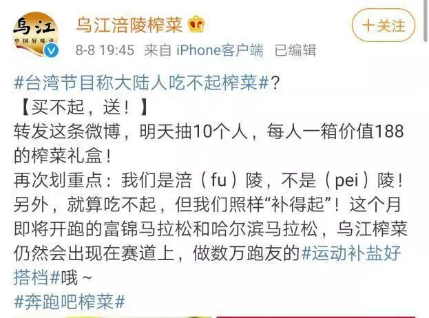 而听说台湾节目竟称大陆人民吃不起榨菜,某品牌榨菜企业也坐不住了,在社交媒体上搞起了抽奖活动,已经许久没有吃过榨菜的网友纷纷表示,从来没有像现在这样需要一包榨菜。奔跑吧,榨菜...哈哈哈哈...