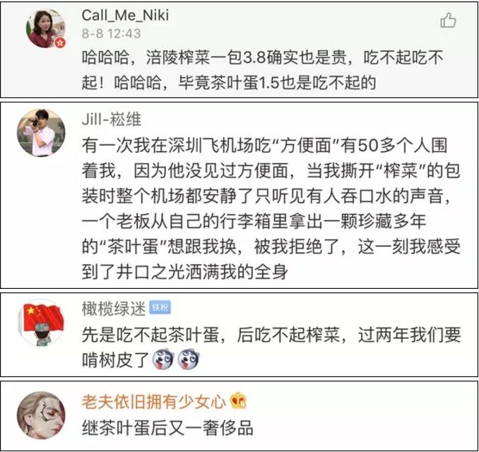 现早已实现茶叶蛋自由的大陆网友听闻台湾节目竟把涪陵榨菜列为中国经济的“晴雨表”,一时间竟不知所措。当榨菜沦为炫富工具,好像加个肉丝都是罪过。