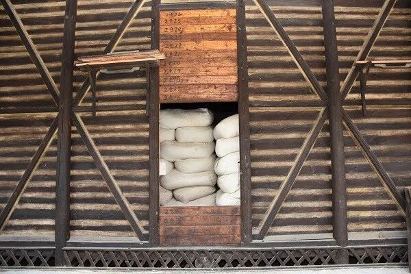 走出茶叶审评室,一座锯齿状建筑立即吸引了我们的注意,这是1950年根据苏联专家提供的设计图样修建的老飘筛车间。一层一层的玻璃结构,即使是几百平的大跨度厂房,室内依旧采光良好。工人们繁忙地进出其间,把用布袋包装的毛茶整齐有序的堆放在这里。