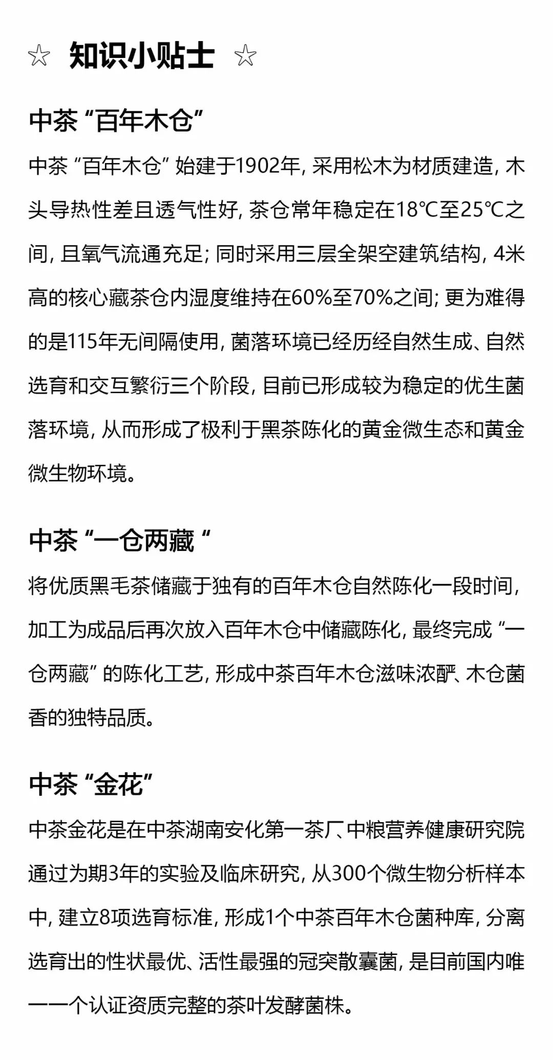 在中茶湖南安化第一茶厂有一条特别的生产车间,是国内首个茶叶专用准CMP级车间。安化第一茶厂携手中粮营养健康研究院通过为期3年的实验及临床研究后,从300个微生物分析样本中,建立8项选育标准,形成1个中茶百年木仓菌种库,分离选育出性状最优、活性最强的优势菌冠突散囊菌——中茶金花菌,首创单一优势菌种发酵,获国家发明专利,中茶牌中茶小金花就是利用此菌株发酵的黑茶。