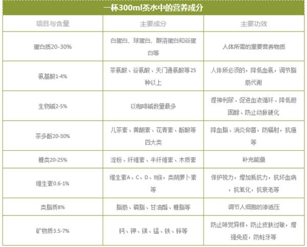 一杯茶,茶叶含有丰富的营养素和药效成分,被称为天然的健康或保健饮料。中外学者专家采用现代科学技术对茶叶的功能进行了深入的分析研究,经检测,茶叶中含有300多种具有营养和保健作用的化学成分: