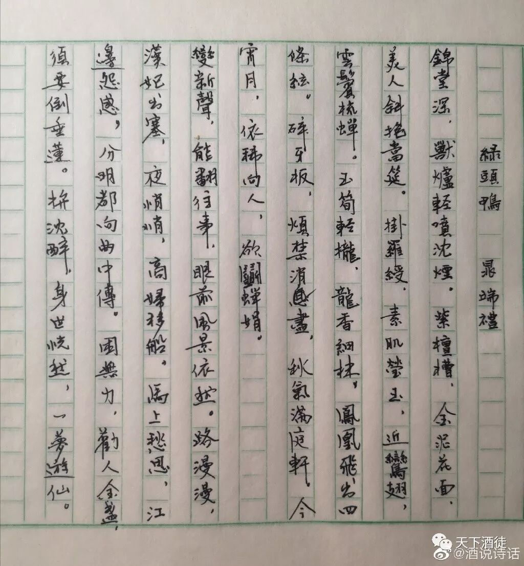 硬笔录了全宋词简编所选晁端礼的《绿头鸭》:“锦堂深,兽炉轻喷沈烟。紫檀槽,金泥花面,美人斜抱当筵。挂罗绶,素肌莹玉,近鸾翅,云鬓梳蝉。玉笋轻拢,龙香细抹,凤凰飞出四条弦。碎牙板,烦襟消尽,秋气满庭轩。今宵月,依稀向人,欲斗婵娟。变新声,能翻往事,眼前风景依然。路漫漫,汉妃出塞,夜悄悄,商妇移船。马上愁思,江边怨感,分明都向曲中传。困无力,劝人金盏,须要倒垂莲。拼沈醉,身世恍然,一梦游仙。”起来看新加入的群还在讨论冻土师娘文,我忍不住写了几句:“冻土发颂师娘文,这还有什么可讨论的。想想,如果《新闻记者》发篇老朱的《玉婚记:太座永远是对的》玉婚记:“太座永远是对的……”,你们会怎么想,怎么骂。”玩叔说,“我们对《新闻记者》没要求。”这话狠。下午接着写一篇流酒账之1月10日赶场局。不到4点,肚子里咕咕咕了。一袋半装方便面挡不住三天没吃肉啊。把这篇流酒账弄完,算真轻松了。 肚子刚叫,钱闻名总就约酒,说几个老乡,要回家过年了,小聚,犹豫一下后,答应了,说只能少喝点。因为太座在马连道,饭局也在马连道,所以我就叫上了太座,她难得同意跟我出来吃饭。 广告