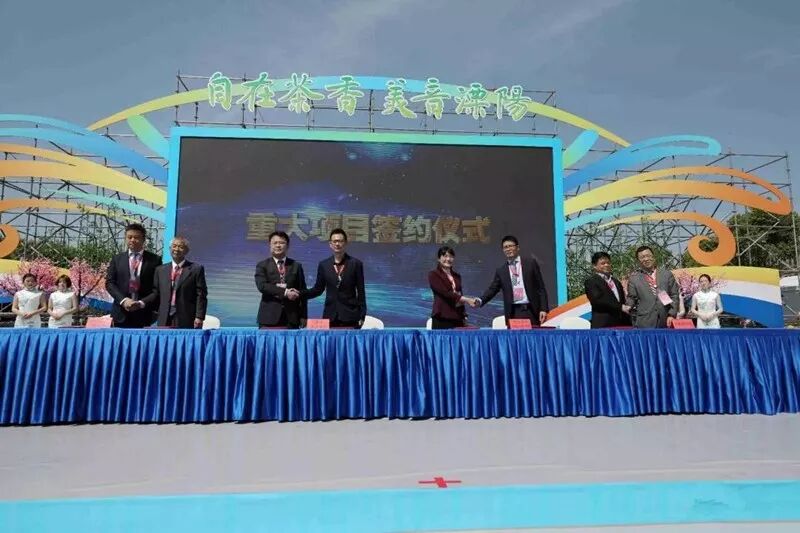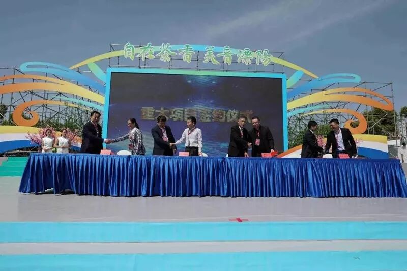 开幕式现场还举行了溧阳市重大项目签约仪式。今年,我市紧扣“重大项目推进年”和“全域旅游推进年”工作主题,以举办“两节”为抓手,以茶为媒,共谋发展,与国内外一大批优秀企业达成了重大项目共建意向。本届“两节”共有启迪乔波冰雪世界、蓝城康养小镇等11个项目在开幕式现场集中签约,其中外资项目2个投资总额达6700万美元,内资项目9个投资总额达92.5亿元人民币。
