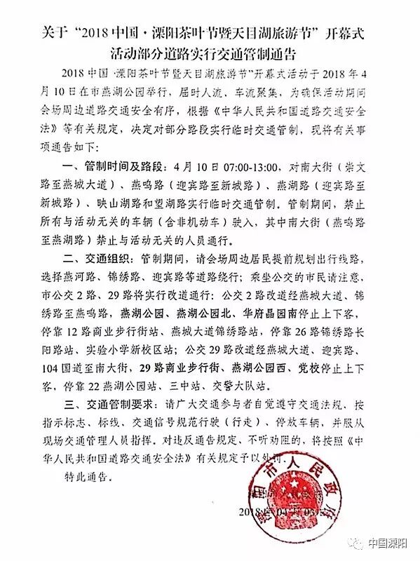 提醒“2018中国·溧阳茶叶节暨天目湖旅游节”开幕式活动部分道路将实行交通管制!