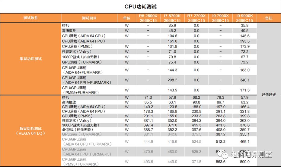 · 功耗上来看,I9 9900K在日常使用中的功耗控制较好,但是FPU烤机测试呈现失控的状态,总体上与R5 2600X的水平相当。