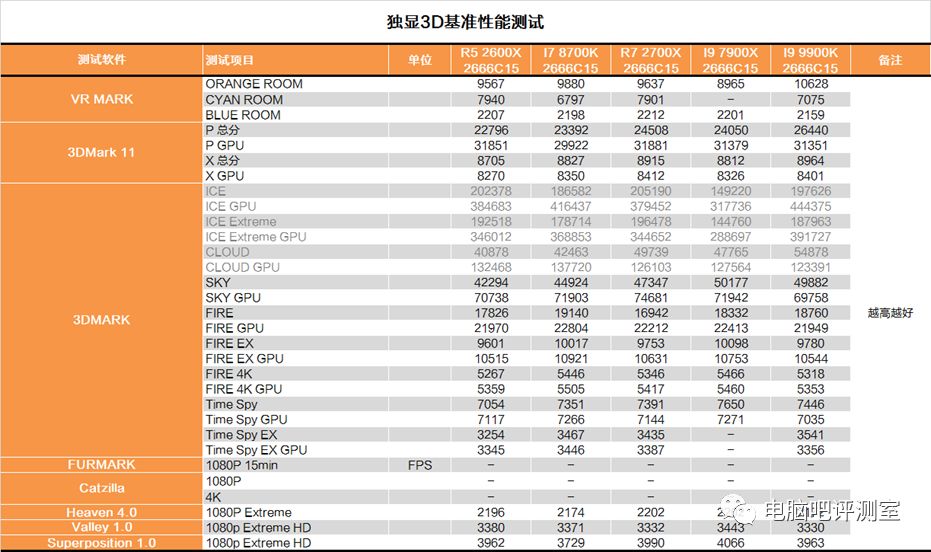 独显3D游戏测试,游戏测试中I9 9900K会是最强的,与R7 2700X的差距在3%左右。