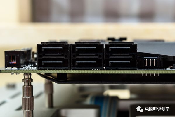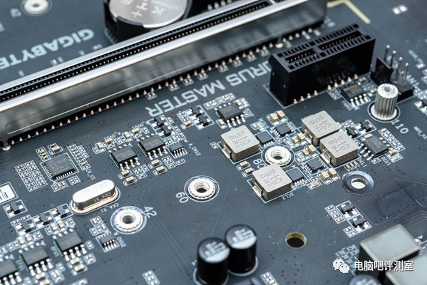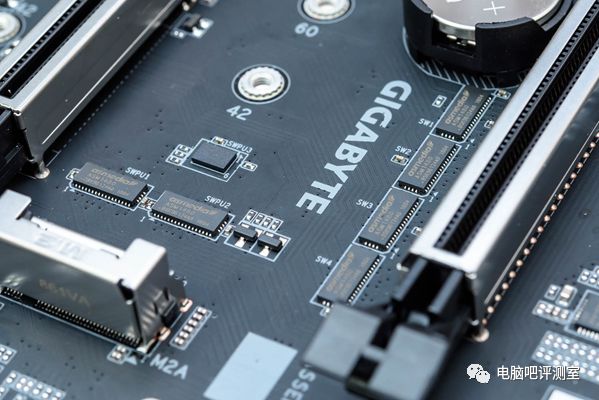 在PCI-E X16和X18之间可以看到6颗PCI-E的切换芯片,四个在一起的是针对显卡插槽的切换,将一根X16拆分成X8+X8。另外两颗是针对M.2SSD插槽的切换。需要注意的是,虽然INTEL一直在吹9900K有40根PCI-E通道。其中直联CPU的仅有16根,其他的是Z390芯片组提供的。不过Z390中所谓的24根其实是通用IO通道,USB 3.1、USB 3.0、SATA3.0、千兆网卡均会占用其中的IO,对于一张Z390来说,实际可以调用的PCI-E通道13~19根(SATA*4~6,USB 3.0/3.1*0~4,LAN*1),所以还是蛮紧张的,需要互相拆借。