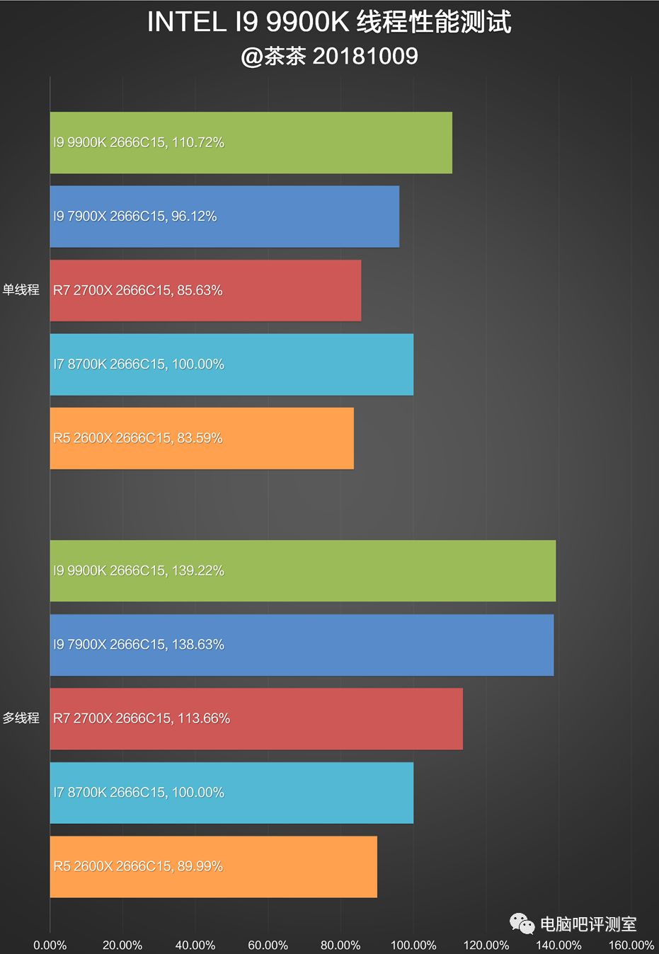 单线程:单线程是I9 9900K最强大的部分,会比I78700K额外提升10%,比R7 2700X提升了30%。