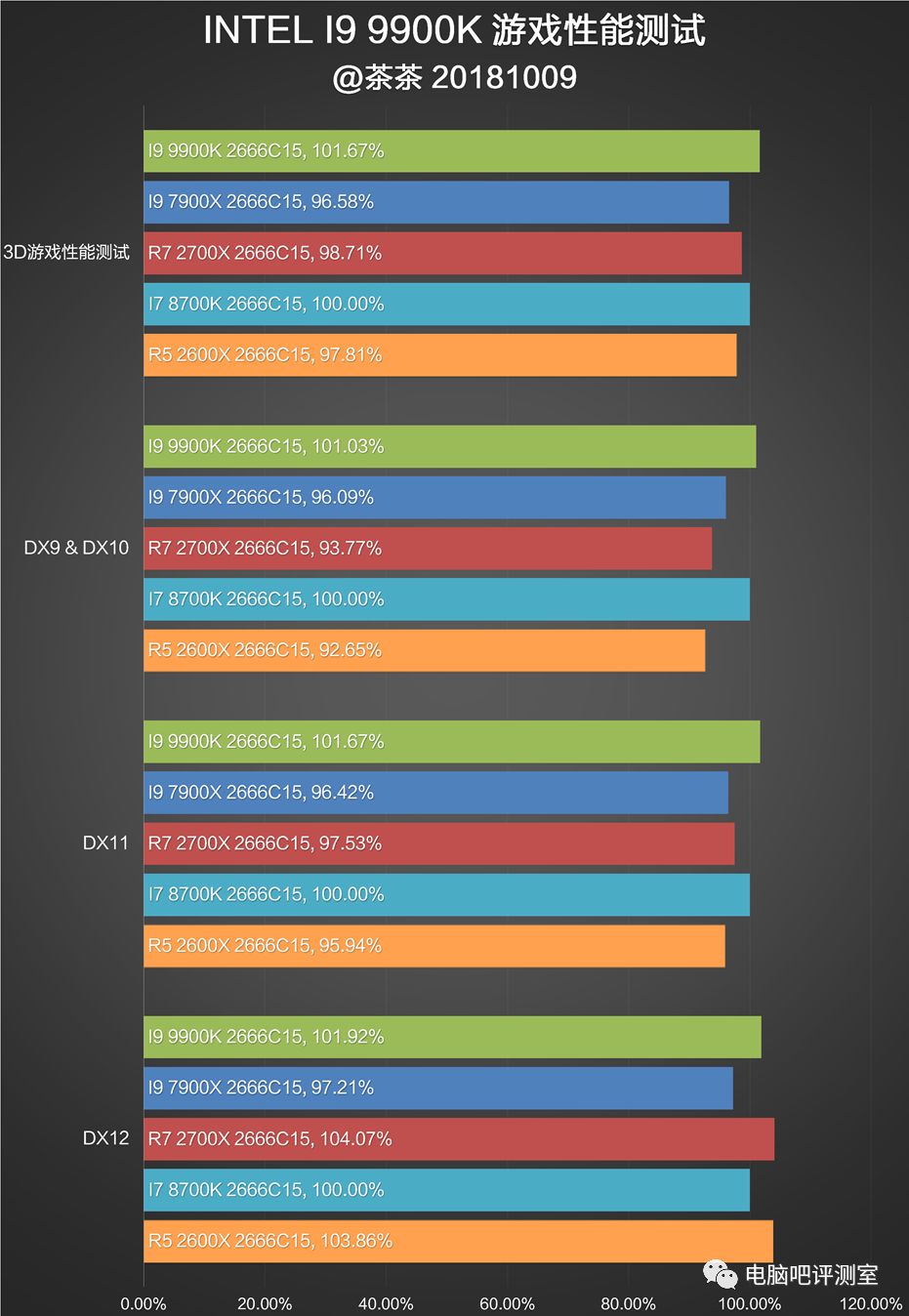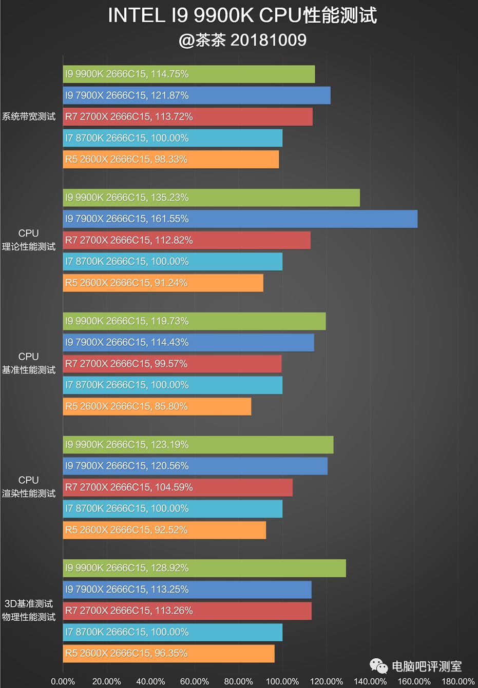 · 就CPU的性能而言,综合各类测试场景,I9 9900K的优势相当明显,相比上一代I7 8700K领先24%,相比AMD的八核R7 2700X领先17.2%,相比越级的I9 7900X领先6.8%。