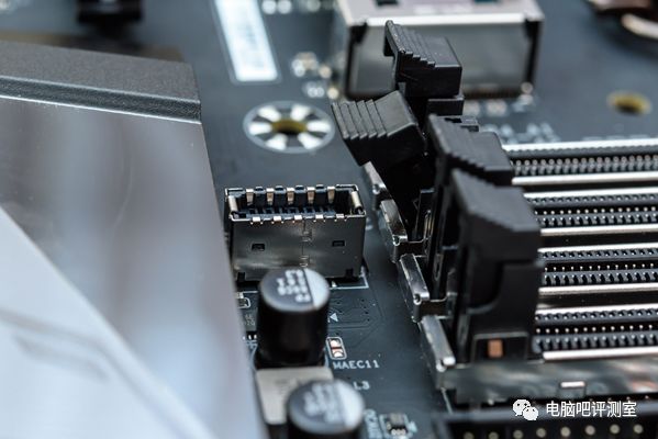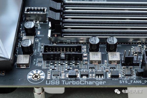 主板24PIN与芯片组之间,有一些前置插座,图中左起分别是左上角的USB 3.1 TYPE-C插座,USB 3.0插座,SYS FAN。其中可以看到前置USB 3.0的电路设计相当复杂,主要是为了满足PD快充的需要,这张主板的前置USB 3.0是支持快充的。
