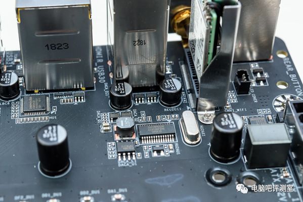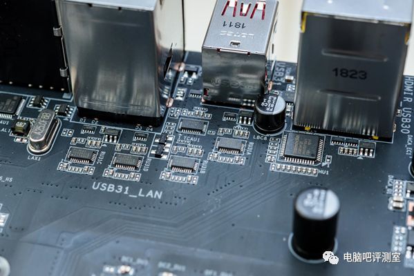 在USB 3.1背后可以看到大量的REDRIVER芯片(P13EQX),这是因为USB 3.1的规范制定有很大的缺陷,线材的信号只能维持一米,所以主板厂商才必须要额外增加芯片来增益USB 3.1数据信号。HDMI接口后面可以看到一颗ASM1442,这是HDMI的电平转芯片。