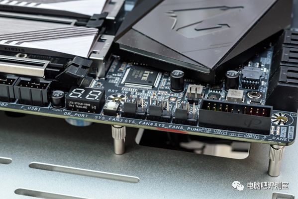 主板下沿的板边有一排机箱内接插座,先看靠近芯片组的一半。从右起分别是机箱控制面板插座、SYS FAN*3、重启按键、DEBUG指示灯、USB 2.0*2。