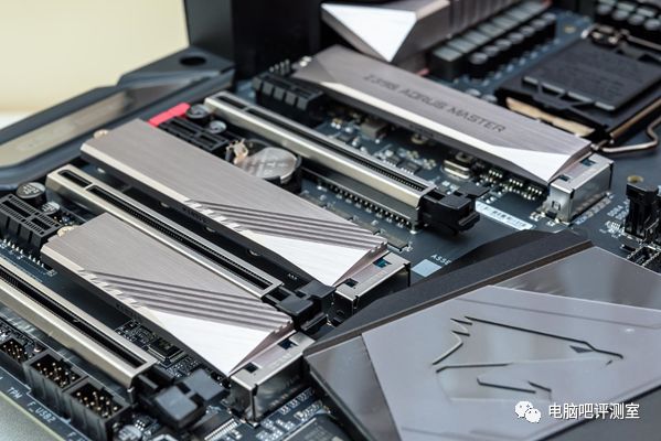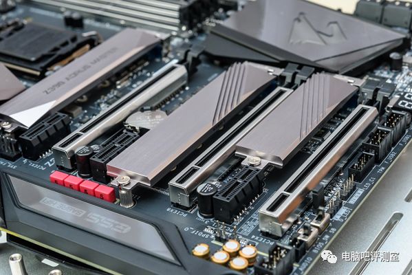 主板板载三个M.2 SSD插座,上面均覆盖有散热片,PCI_6位置上的是2280长度,其他两个是22110。