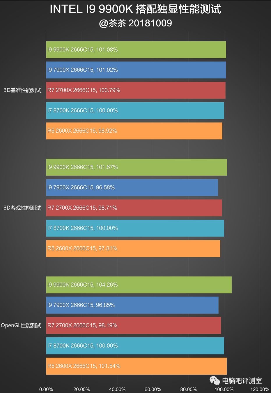 · 而搭配独显的部分,I9 9900K相对也会更强,相比I7 8700K领先1.5%,相比R7 2700X领先2.2%,相比I9 7900X领先3.6%。