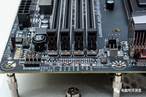 靠近内存插槽的角落可以看到一排电压检测点,图中右边是CPU FAN和SYS FAN,左边是RGB 4PIN灯带插座、VDG数字灯带插座。