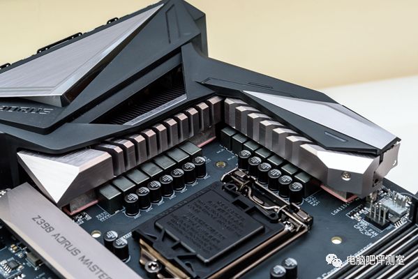 主板CPU供电的散热设计的相当复杂,技嘉在传统的挤铝散热片上额外焊接了铝制鳍片。底座则采用了热管+热管直触的设计。