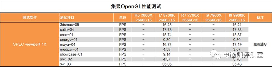 集显OpenGL基准测试,专业软件部分以SPECviewperf 12为基准测试。