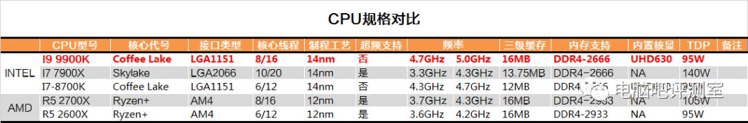 最后上一张横向对比的表格供大家参考。性能部分仅对比与CPU有关的测试项目,并不包含游戏性能测试的结果。
