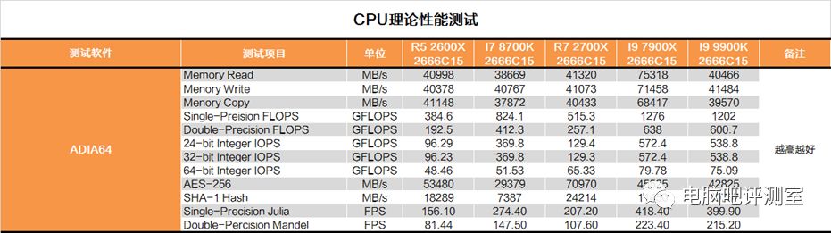 CPU理论性能测试,是用AIDA64的内置工具进行的,刨开内存带宽,其他各项计算能力相比I7 8700K大致都提升45%左右。折算频率后,I7 8700K与I9 9900K的单核IPC性能基本一致。